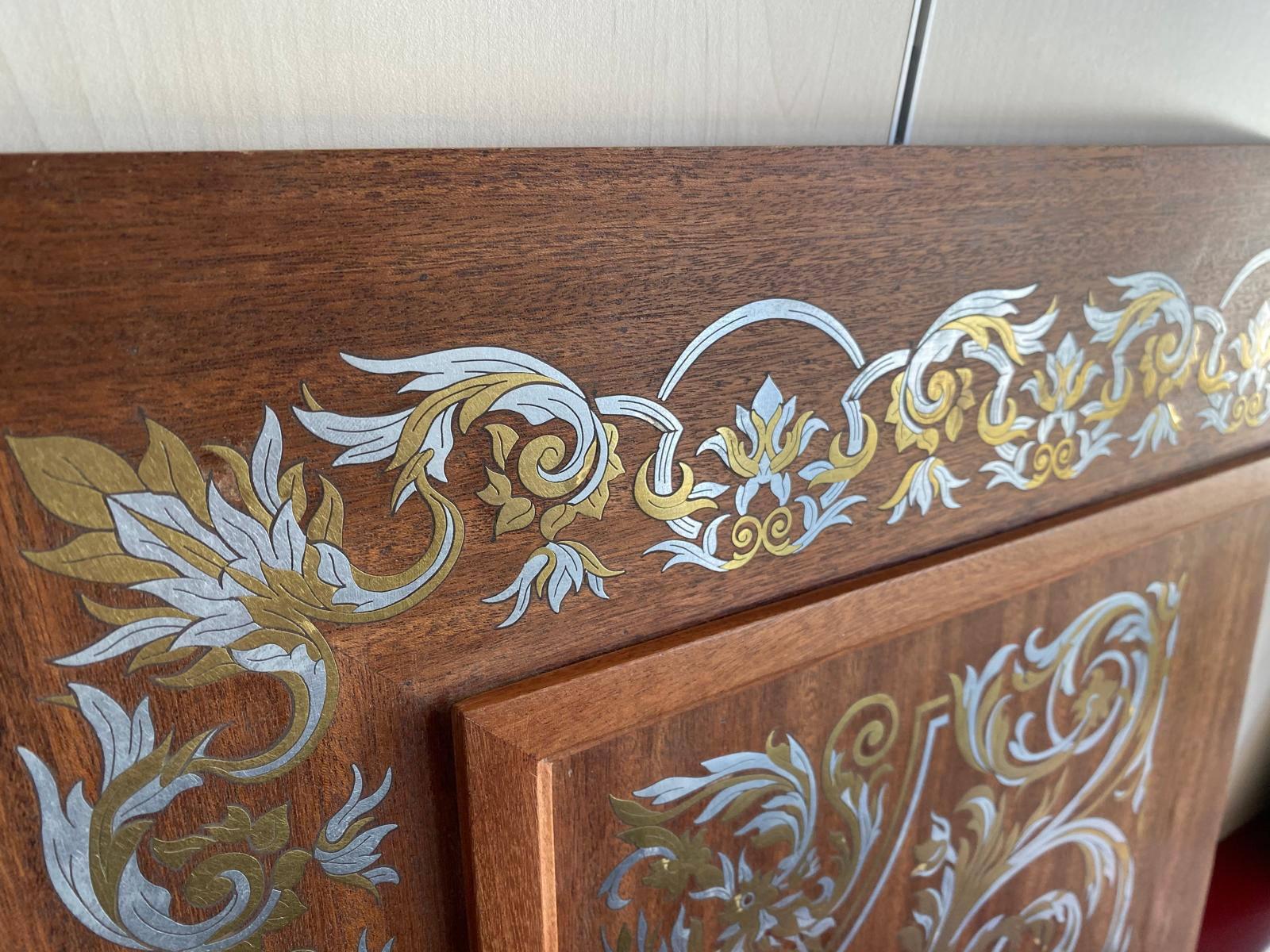 Our master carvers work entirely by hand — chiselling arabesques, geometric patterns, and floral relief over weeks. Work that no machine can produce.